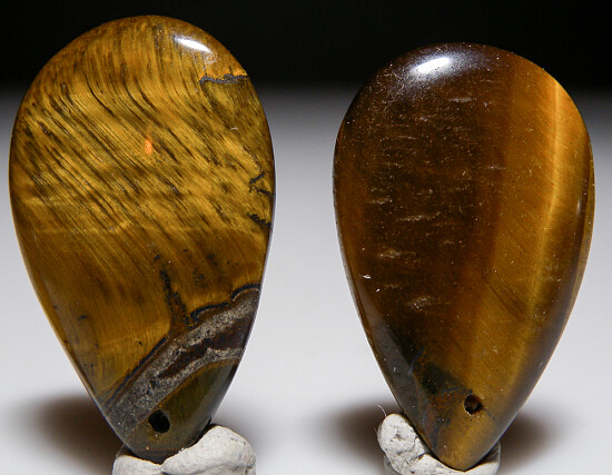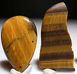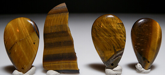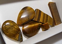 Six pieces of Quartz var. Tiger Eye. Three are teardrop-shaped beads, two are small slabs, and one is a polished perfect cube.