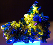 New find of Dioptase crystals with white Willemite crystals from near Mindouli. Aesthetic specimen rich with Dioptase crystals. The Willemite glow yellow under UV lighting in the last photo.