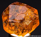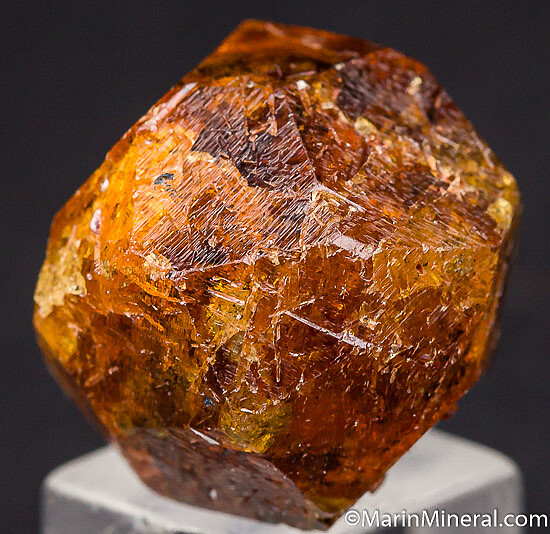 Complete 'citrus' orange Spessartine crystal from old finds in Tanzania. These were mostly found as partial or damaged crystals with complete crystals such as this much less common. Excellent form with no significant damage (one small edge chip). Translucent with great color and transparent zones inside. Weighs 19.35 grams (about 96 carats).