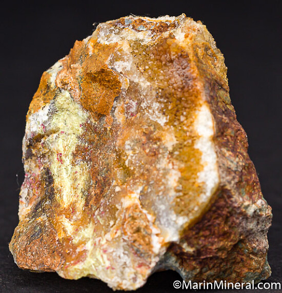 Silica rich matrix with Quartz crystals and numerous areas of bright yellow Karpatite. Karpatite is an uncommon organic mineral, which is also fluorescent. Small red flecks of Cinnabar are also present. Rare stuff!!