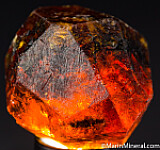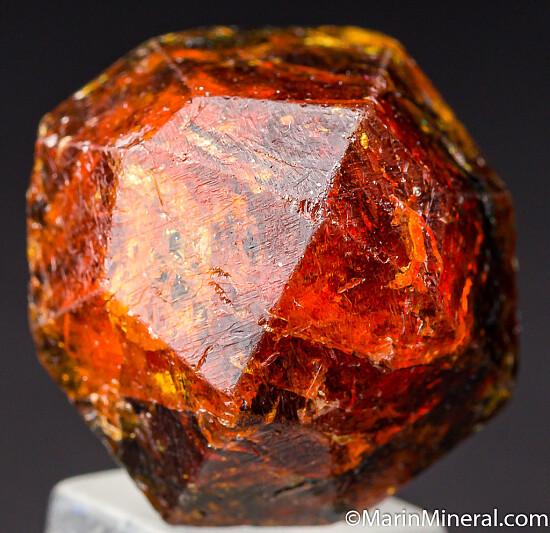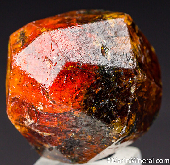 Complete 'citrus' orange Spessartine crystal from old finds in Tanzania. These were mostly found as partial or damaged crystals with complete crystals such as this much less common. Excellent form with a few small edge chips and surface pits but no significant damage. Translucent with great color, there are some darker black included areas but also areas of superb gem transparenct. Weighs 37.30 grams.