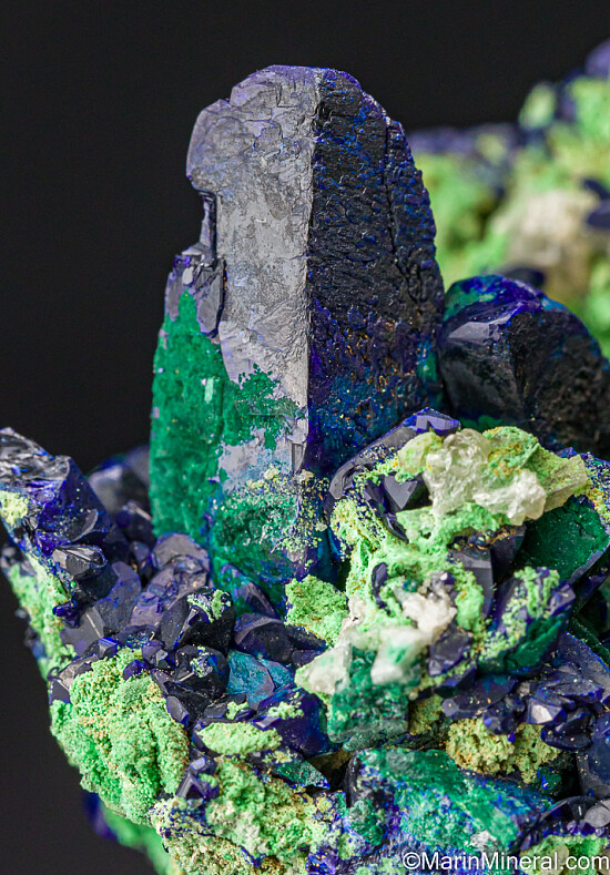Cluster of prismatic Azurite and Malachite after Azurite crystals with Arsentsumebite and Cerussite. I just the love the highly colorful specimens from this mine and this is a prime example of such a specimen. A very colorful mixture of blue, deep green Malachite, lighter green Arsentsumebite, and small crystals of Cerussite scattered about. Comes with an old Phil Scalisi label.