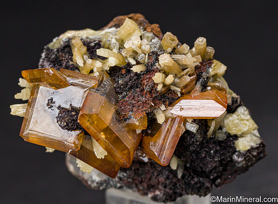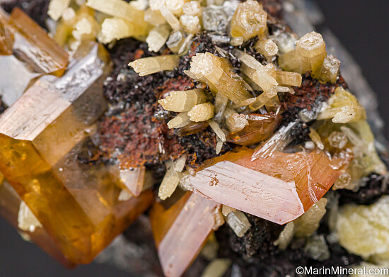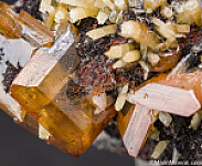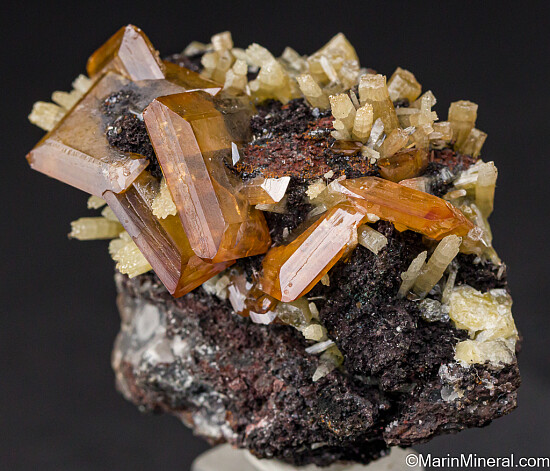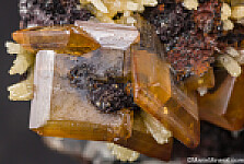 Translucent to transparent amber-colored Wulfenite crystals associated with yellow Mimetite. There is some breackage on some of the Mimetites but the Wulfenite are all good and reach 1.5cm on edge.