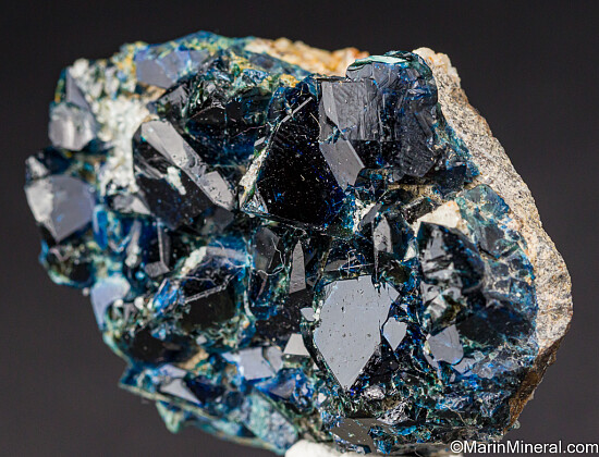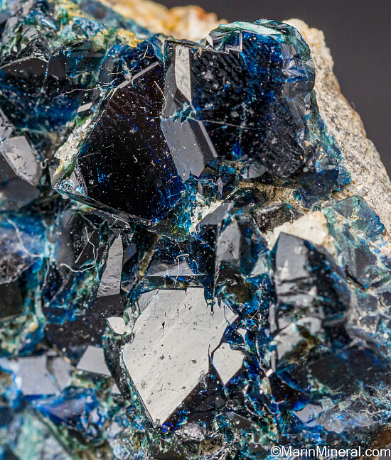 Large, lustrous crystals of deep blue Lazulite, the most well known of the 'Yukon phosphate' minerals found at this locality. Individual crystals are good sized for the locality reaching 1.2cm.