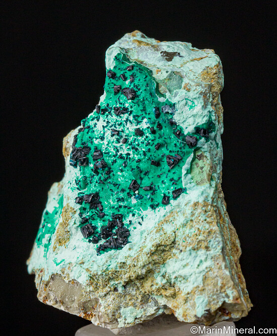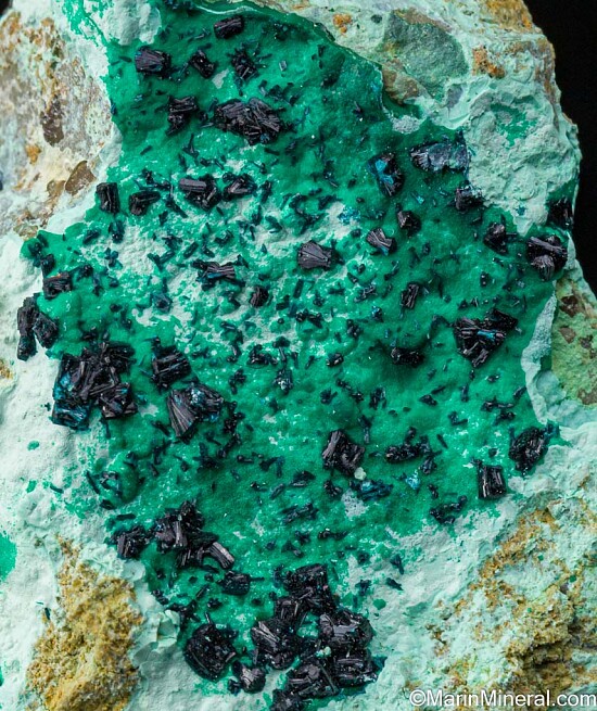 Deep blue crystals of Clinoclase over green Cornubite from the now defunct Majuba Hill Mine. Clinoclase is an uncommon Copper arsenate species that forms beautiful crystals with bright teal blue color. The green Cornubite adds excellent color contrast.