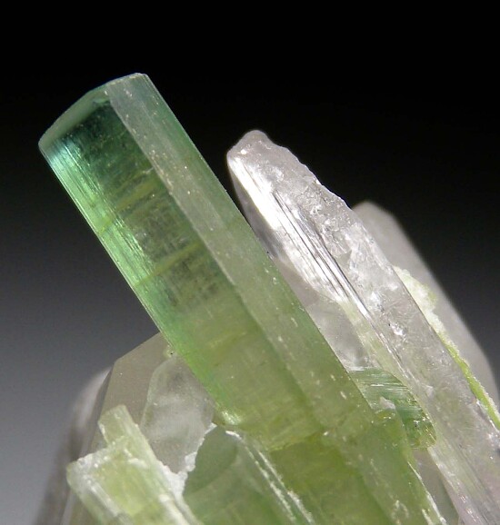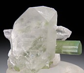 Cute specimen of gemmy green Tourmaline crystals on a doubly-terminated Quartz crystal with a 3.6cm doubly-terminated Kunzite crystal. Ex. Len Pisciotta collection.