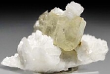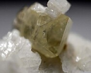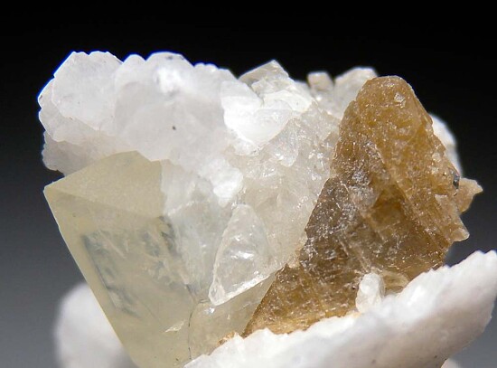 Glassy and gemmy single crystal of yellow Amblygonite on Albite crystals with attached Albite crystals and an unidentified translucent golden brown mineral. Undamaged and fine. Amblygonite is a rare lithium-aluminum phosphate species that is not commonly seen in fine display quality crystals. Small but mpressive specimen!