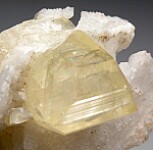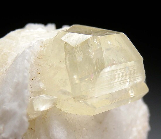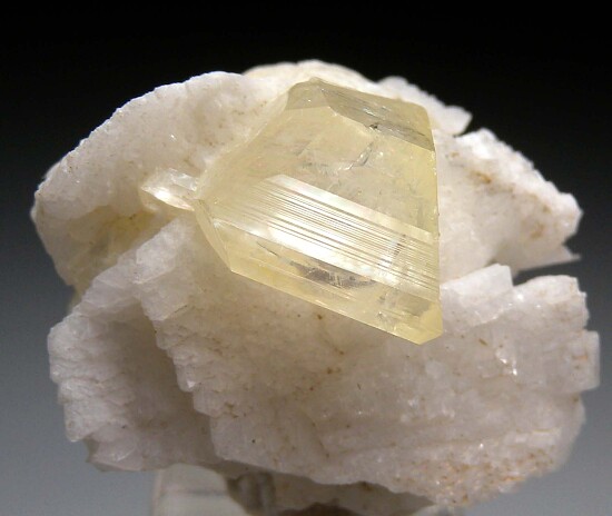 Stunning, sharp yellow Amblygonite crystal attached to the front of an Albite crystal. Amblygonite is a rare lithium-aluminum phosphate species that is not commonly seen in fine display quality crystals. This crystal is complete all around and 1.2cm wide. Translucent with transparent gem areas and with high glassy luster. Interestingly, all the faces have bright glassy luster, except the right side which has matte luster and attached small hemispheres of an unidentified mineral. A superb, undamaged toenail Amblygonite!