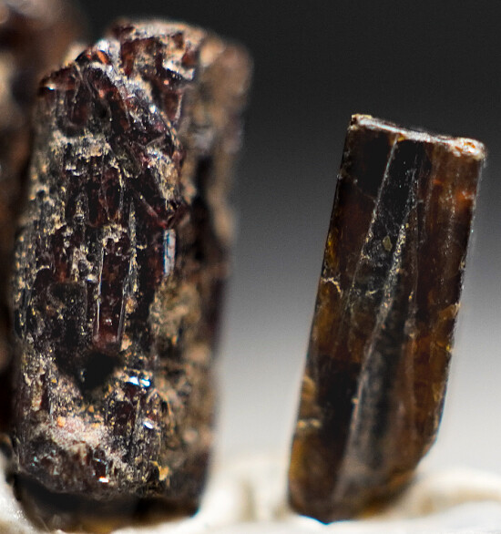 Five crystals of rare Painite from the legendary Mogok gem tract (my last ones!). Painite is a rare gem species that wasn't discovered until the 1950s. For a while, only and handfull of crystals were known and owning a Painite specimen was nearly impossible. Only more recent discoveries in Mogok have made Painite more readily available to collectors. Painite crystals are always small, have a hardness of 8, and contain both zirconium and boron, which are rarely found together in minerals.