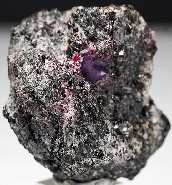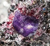 A single purple/red crystal of Ruby in a matrix of biotite schist. This locality is known for Corundum of mixed colorations and could be labelled as either Sapphire or Ruby.