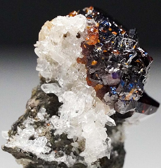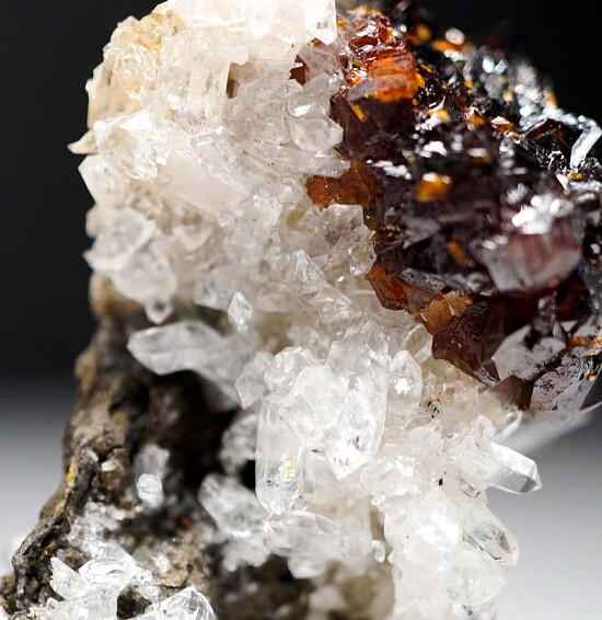 A 2.3cm Sphaerite crystal with Quartz crystals on matrix from an undisclosed locality near Clinton, New York. The few of these known were reportedly collected by a man named Adrian LaBuz in the 1960s who never revealed the exact location.