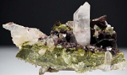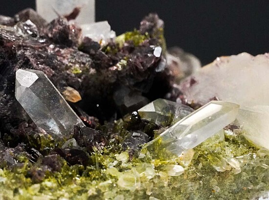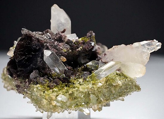 Very colorful specimen of purple Axinite, Quartz crystals, and green Epidote. What's amazing about this piece is that the thin green rock matrix detached in the pocket and is fully covered all around by Quartz crystals - top, bottom, all sides! It's an undamaged floater with great crystals on all sides. The green and purple color combined with crystals sticking out in all directions make this a super aesthetic specimen. Ex. Len Pisciotta collection. This was listed at $350 in my regular website galleries.