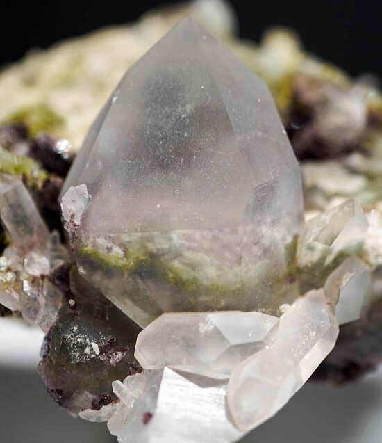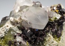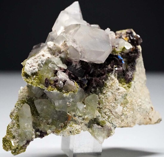Here's a beautiful, large display specimen of purple Axinite crystals, large clear Quartz crystals, and green Epidote from the premier California locality for Axinite. Specimens were found here in 1981 during construction of a spillway at the reservoir. This specimen features a large 4.5cm transparent Quartz crystal in perfect condition surrounded by blades of purple Axinite. Green Epidote adds more color. There is is even Axinite and Epidote included within the Quartz. Ex. Len Pisciotta collection. Valued at $400.