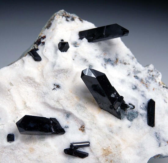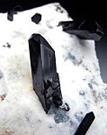 Glossy black Neptunite crystals on a white Natrolite covered matrix. This is an excellent Neptunite with 3 main crystals that are well separated and rise up out of the matrix plus numerous smaller crystals. Ex. Len Pisciotta collection and comes with an old Andy Seibel label.