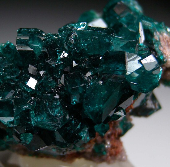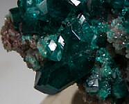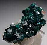 Highly lustrous Dioptase crystals over tiny Calcite crystals from Tsumeb. Individual crystals reach 1.3cm long. Ex. Len Pisciotta collection.