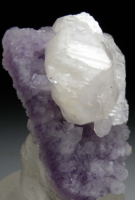 A large white Calcite crystal attached to a layer of solid Amethyst crystals. This is a really lovely old specimen with a complete 4cm wide Calcite crystal. The Amethyst is crystallized on both sides. Ex. Len Pisciotta collection.