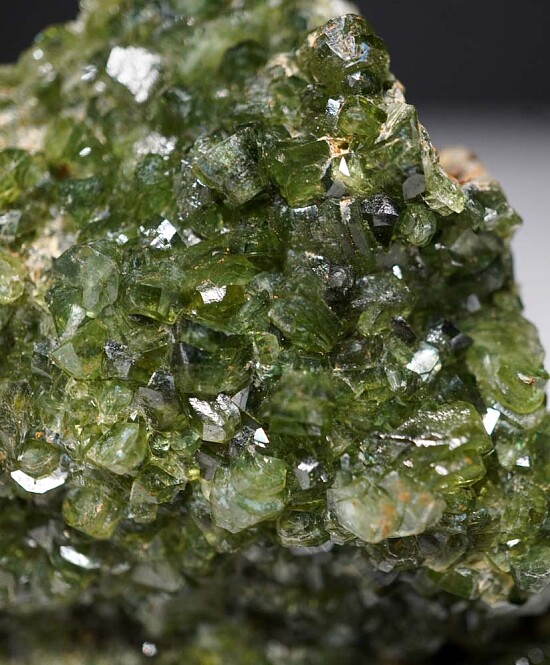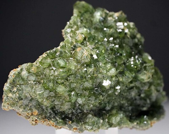 Glassy bright green Ludlamite crystals on matrix from a relatively new locality in northwestern Brazil. The crystals are bright and translucent to transparent. The specimen is almost all crystals with very little matrix attached to the back. Gorgeous good-sized specimen loaded with crystals. Valued at $400+.