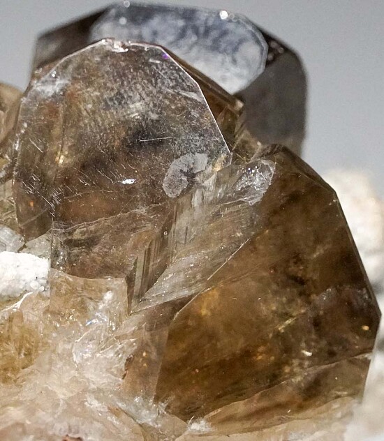 Glassy Cerusite crystals to 4.5cm wide on matrix from Tsumeb. The crystals are smoky in color with high glassy luster and good transparency. In good overall condition and can be displayed from either side.