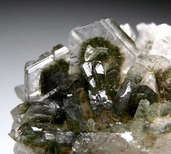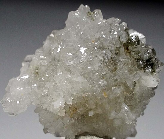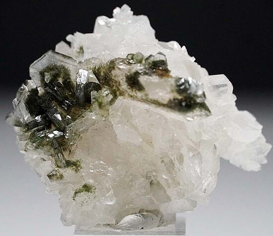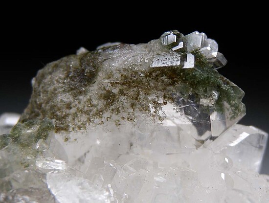 Cluster of glassy, transparent Albite with an attached Quartz crystal. This is an exceptional Albite with glassy transparent crystals, an excellent piece for a Feldspar suite. Both the Albite and Quartz have inclusions of green Chlorite. Well crystallized all around. Ex. Len Pisciotta collection. Don't overlook this specimen - it's really good!