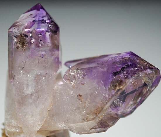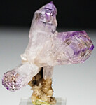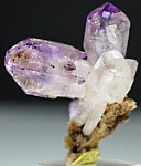 Diverging 'starburst' formation of Amethyst scepters from Las Vigas. There are 3 main crystals in the formation all shooting off in different directions - it's hard to see the 3 dimensional effect of the diverging crystal in the photos. All are glassy and undamaged. An excellent piece that stands out from the crowd. Ex. Len Pisciotta collection with old label showing a price of $250.