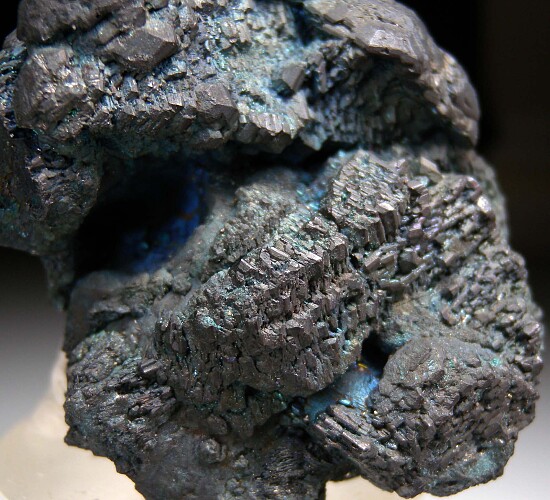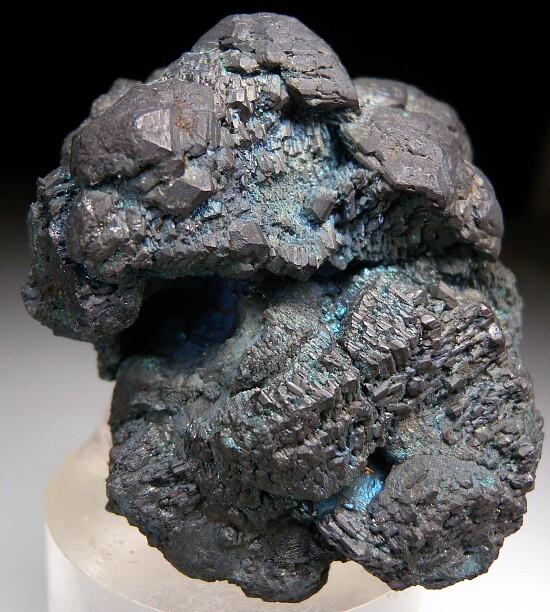 Chunky specimen of solid Chalcocite crystals from the now closed Flambeau Mine. The surface is covered by dark metallic crystals with light blue and purple iridescence. Valued at $950.