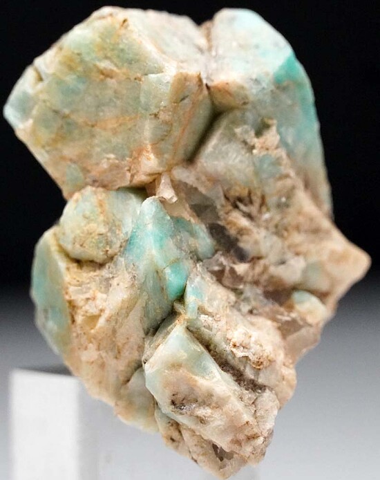Cluster of Amazonite crystals with Quartz from Colorado. Good crystals to 2.5cm long with a light blue/green color. Collected by John Sulzbach in 2013 and comes with his old label.