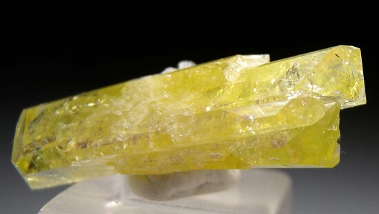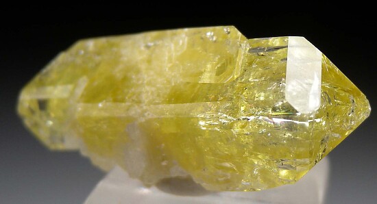 Glassy and gemmy Brazilianite crystal from the Telerio Mine in Brazil. This is a doubly-terminated crystal complete all around. A floater with a sidecar crystals and Albite. Ex. Len Pisciotta collection. Len hunted for doubly-terminated Brazilianites for years and this one is from the small sub-collection he assembled.