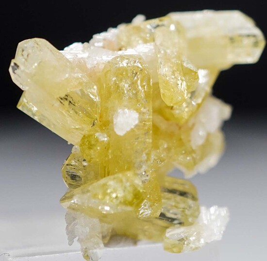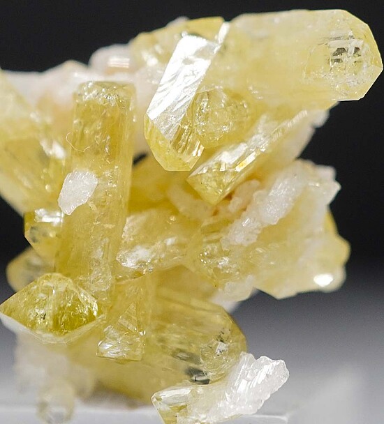 Crystals of glassy yellow Brazilianite on Albite. These are high quality, lustrous crystals to 1cm in size. Undamaged, aesthetic specimen. Ex. Len Pisciotta collection.