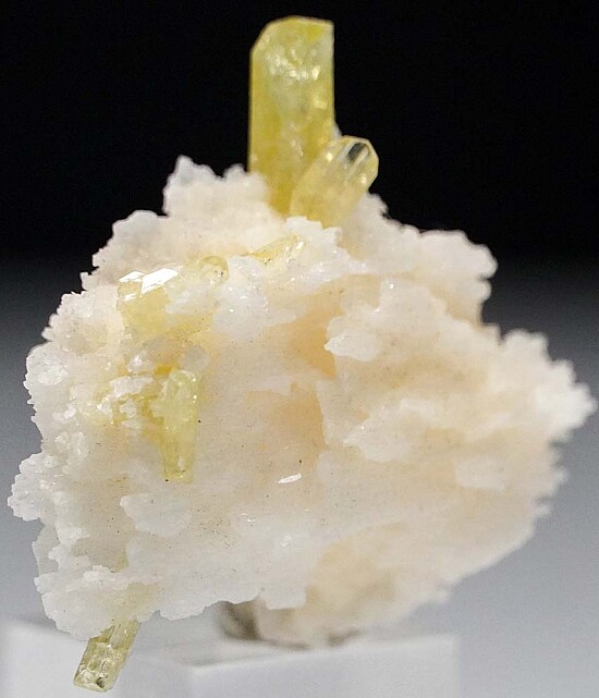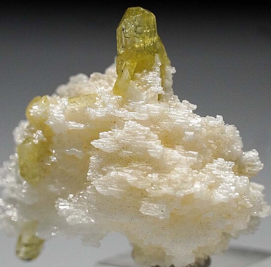 Crystals of glassy yellow Brazilianite on Albite. These are high quality, lustrous crystals to 1cm in size. Undamaged, aesthetic specimen. Ex. Len Pisciotta collection.
