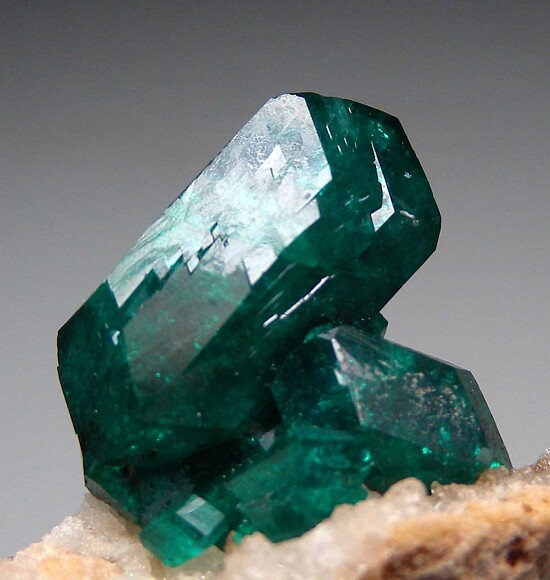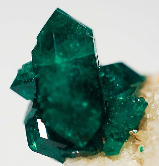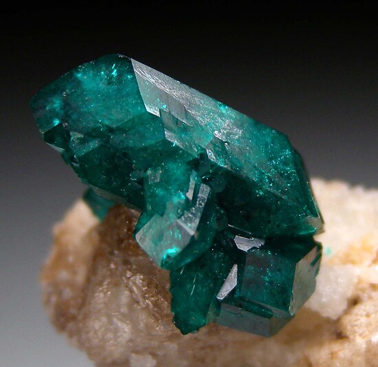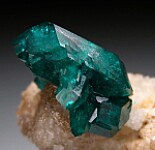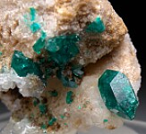 Dioptase crystals on matrix from the old Altyn-Tyube deposit in Kazkhstan. The crytals are in perfect condition and reach 1.5cm in size, the largest and several others are doubly-terminated. Ex. Len Pisciotta collection (his old label shows a price of $550).
