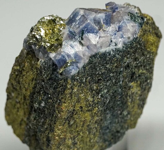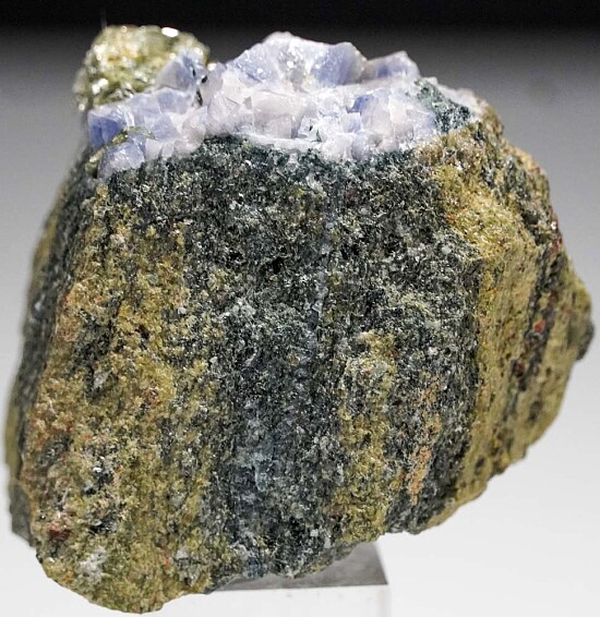 Blue to white crystals of rare Lawsonite in a Glaucophane schist matrix. Old specimen from the Type locality for the species, collected by Chuck Trantham back in 1968. Rare stuff! Ex. Chuck Trantham.