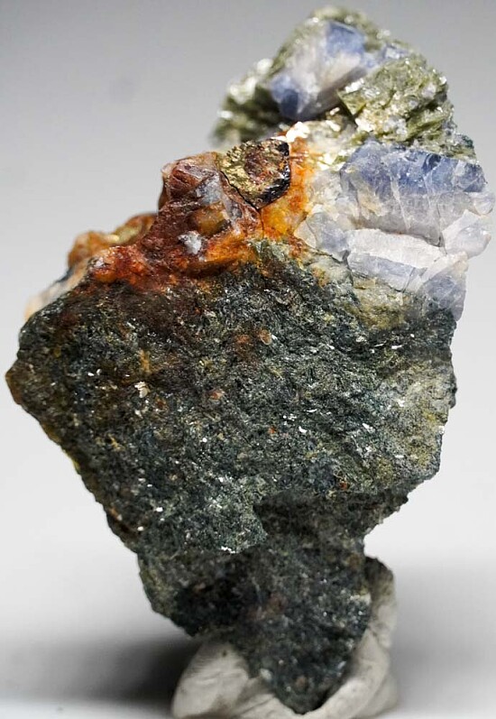 Blue to white crystals of rare Lawsonite in a Glaucophane schist matrix. Old specimen from the Type locality for the species, collected by Chuck Trantham back in 1968. Rare stuff! Ex. Chuck Trantham.