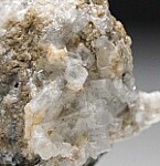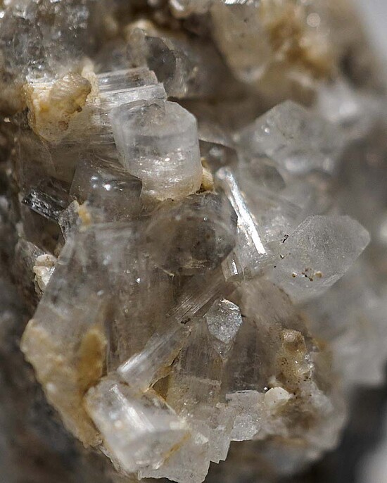 Colorless, translucent to transparent Thomsonite crystals in vug. The Thomsonite form prismatic crystals with flat terminations. Collected by John Sulzbach in October 2014.