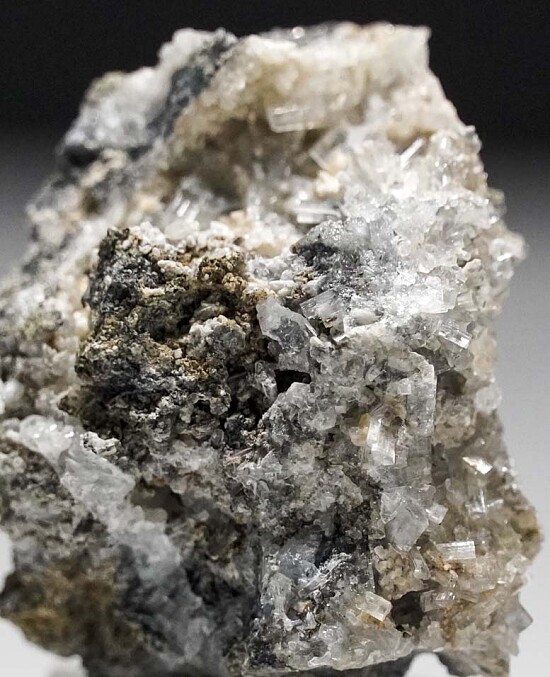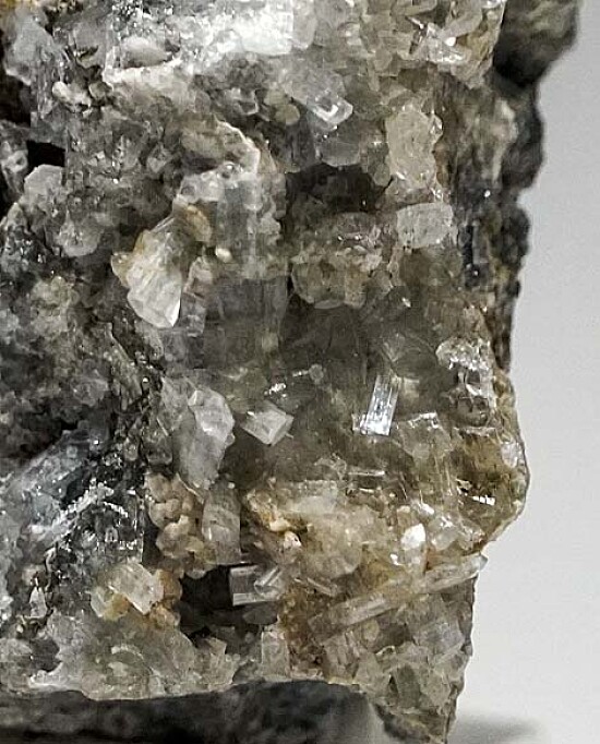 Colorless, translucent to transparent Thomsonite crystals in vug from a small find. The Thomsonite form prismatic crystals with flat terminations. Collected by John Sulzbach in October 2014. An excellent addition to a San Benito suite of minerals.
