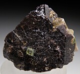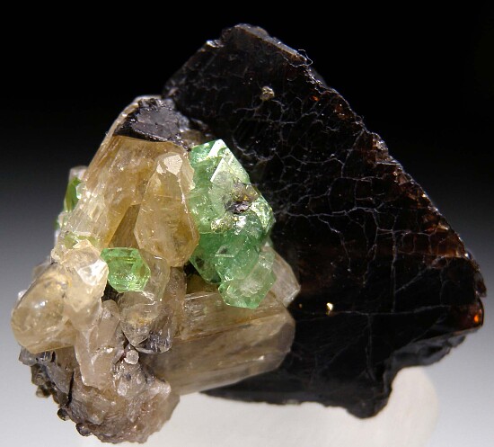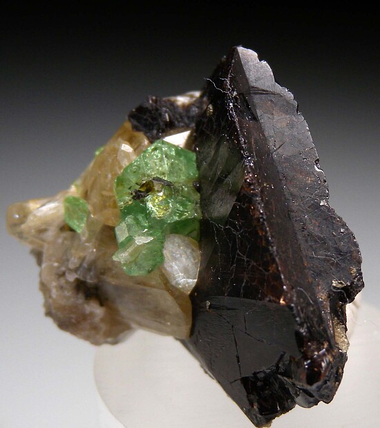 This is a really neat and aesthetic combination specimen from the Merelani Tanzanite mines. A large, chocolate brown twinned Titanite with attached green Tsavorite and white Diopside crystals on one side. Titanite crystals are fairly uncommon at Merelani.