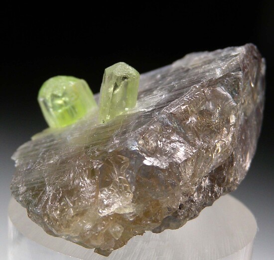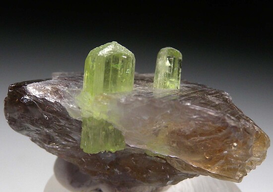 Two terminated green Diopside crystals spearing through a partial Tanzanite crystal. This is a colorful and unusual specimen unlike any I can recall seeing before. The Tanzanite is thick too, with good sized transparent areas that give this piece cutting rough value. It weighs 24.58 grams (122 carats).