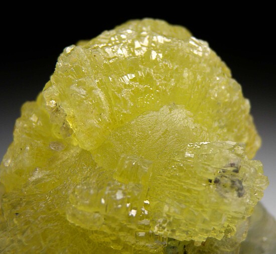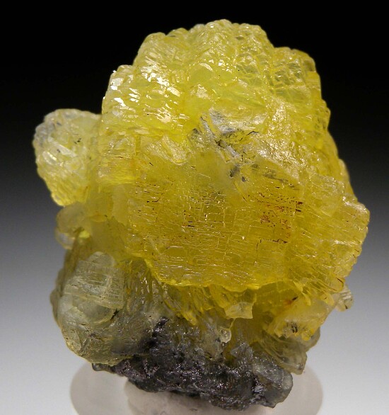 Well crystallized group of translucent Prehnite with a bit of attached Graphite on the base. Somewhat spherical in shape with great lemon yellow color.