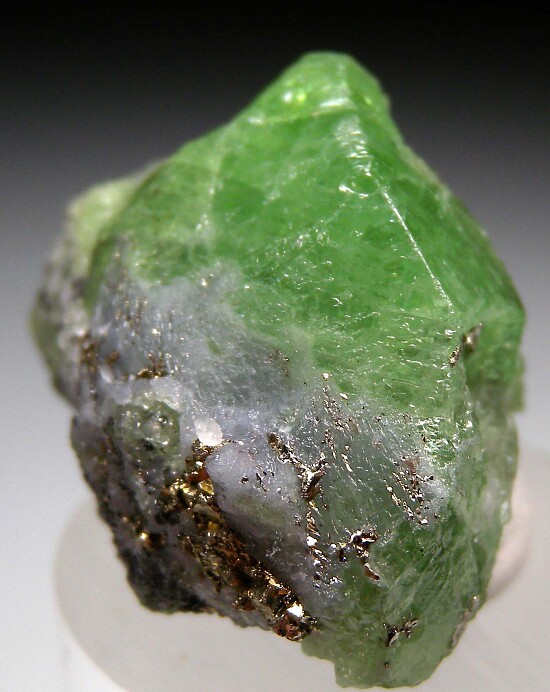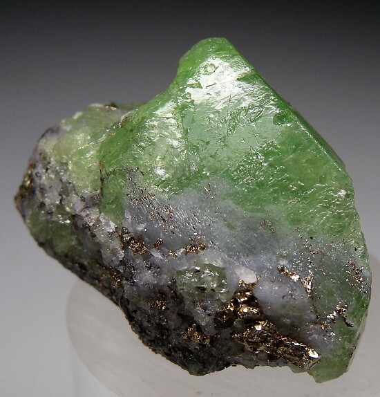 Rare example of a large Tsavorite crystal that is partially altered to Tanzanite in areas, the only one like it I've ever had. Pyrite crystals are also present along with some Graphite on the bottom.