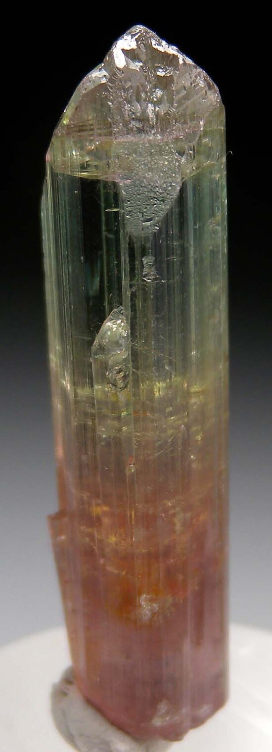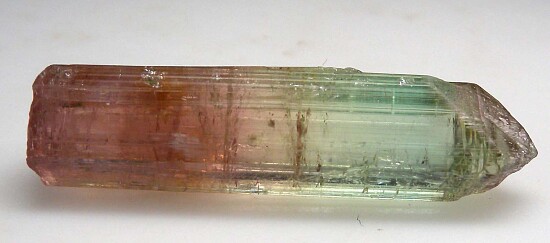 Well terminated single Tourmaline crystal from recent finds in the Congo. The crystal grades up from red at the base to a medium green. Complete all around and undamaged and weighs 8.14 grams. These new Tourmaline from the Congo are some of the best quality, most transparent Tourmaline ever found. When you can find them, Congo Tourmaline typically sells for $100-$300 per gram, with exceptional pieces selling for much higher.