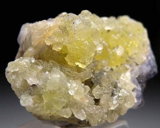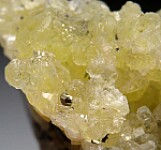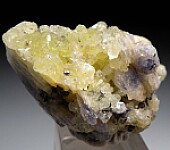 Lemon yellow Prehnite crystals inter grown with Tanzanite from the Merelani Tanzanite mines. There are two Tanzanite crystals, the largest is 2.5cm tall. Most worldwide Prehnite forms botryoidal groups - Merelani is known for some of the worlds best crystals of Prehnite. Small Pyrite and Graphite crystals are also present.