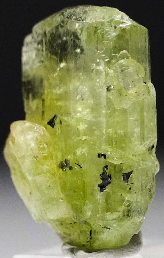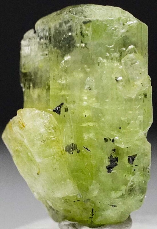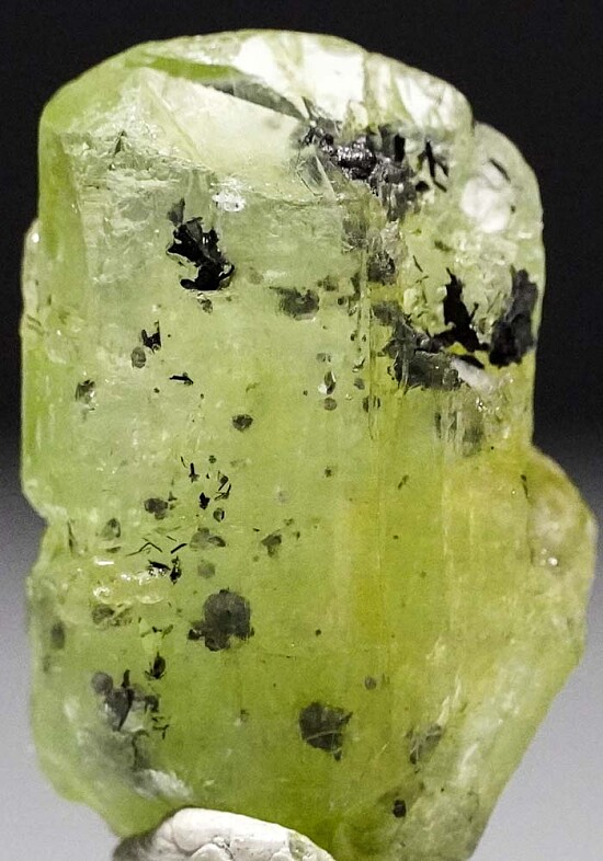 Well terminated single crystal of green Diopside from the Merelani Tanzanite mines. This crystal has a good medium green color and is complete all around. Good transparency that shows well the inclusions of platy grey Graphite crystals!!! Merelani is one of the few places you find good Graphite crystals and they only place I know where they are found included in gem crystals.