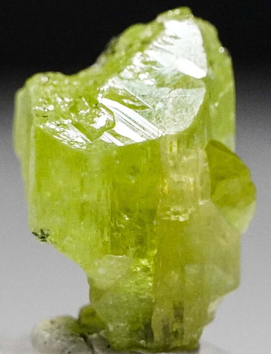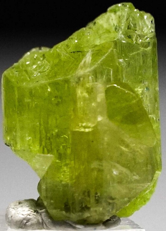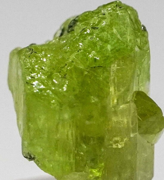 Glassy green crystal of Diopside from the Merelani Tanzanite mines. Mint green with areas of transparency. The termination has a mixtures of flat crystal faces and areas that grew into Graphite.