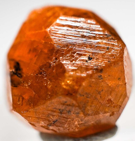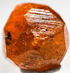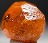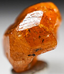A single translucent crystal of orange Spessartine from Tanzania. The Spessartine has good color and is complete crystallized all around though the backside is indented where it was formerly attached to a Kyanite crystal.