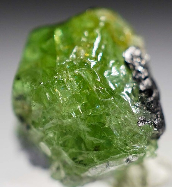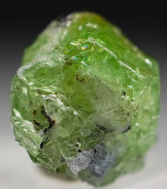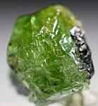 Single crystal of the vanadium and chromium rich Grossular Garnet known as Tsavorite. This variety was discovered in east Africa in 1967 and named by Tiffany & Co. for the nearby Tsavo National park. Vivid, radiant green color makes this specimen good color for Tsavorite, with bright, glassy crystal faces on front and bits of attached Tanzanite and Graphite.