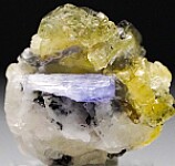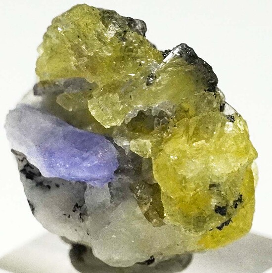 Really neat combo specimen of well crystallized lemon yellow Prehnite with attached Tanzanite crystals all on crystalline white Calcite. The Prehnite is colorful and translucent and crystallized front and back.