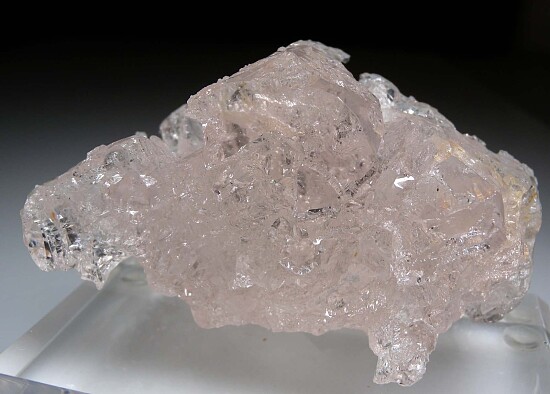 Large and glassy single pink Beryl var. Morganite. Though etched, it is highly lustrous and the original hexagonal form is obvious and has uniform shape and flat front, back, and edge faces. Comes with a custom Lucite display stand. Ex. Len Pisciotta collection.