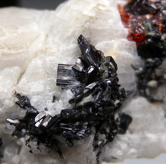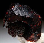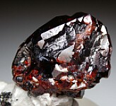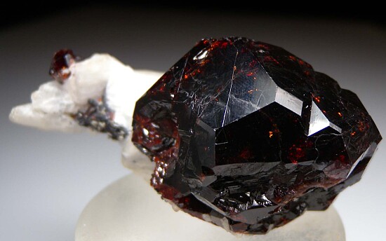 A large deep wine-red Spessartine crystal on white feldspar with other smaller Spessartine crystals and black crystals of what is possibly Tantalite. The main crytals is 4.5cm in size and very complex, featuring typical flat crystals faces, etched faces, and a hollow area on the left side with a mound-shaped crystal mass in the center. The main crystal is fully crystallized all around and nearly pristine. Ex. Len Pisciotta collection and one of my favorite pieces in the collection.