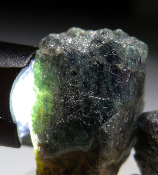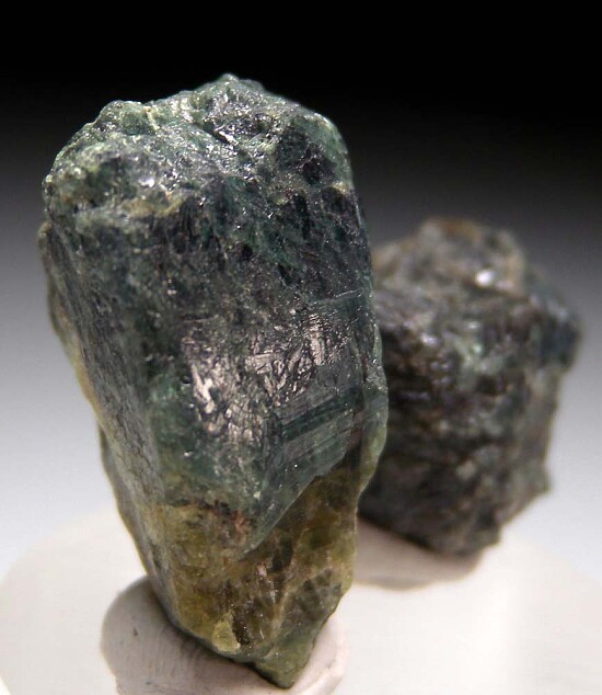 Two crystals of Alexandrite from Zimbabwe. The crystals are green and show translucency when backlit along the edges.