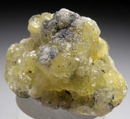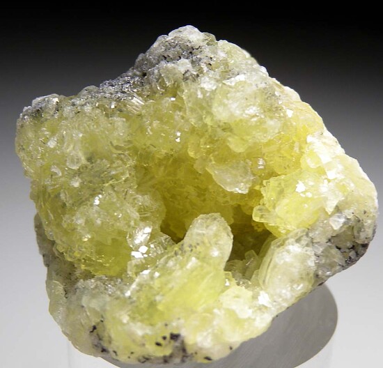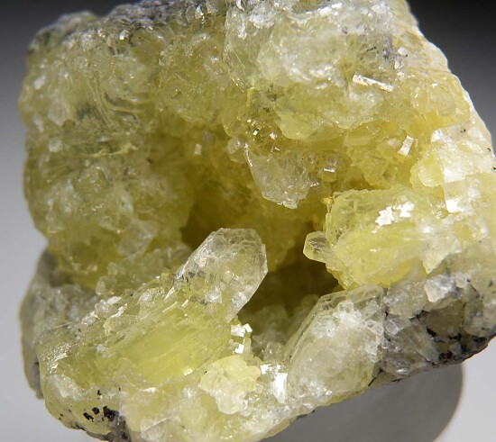 Cluster of lemon yellow Prehnite crystals on Graphite from the Merelani Tanzanite mines. These are usually found as mound-shaped clusters and thhis one is a little different with an open vug with distinct crystals pointing inward.