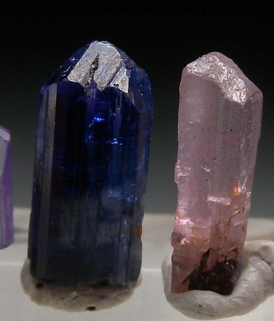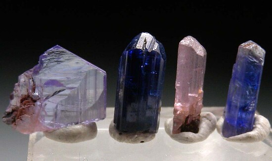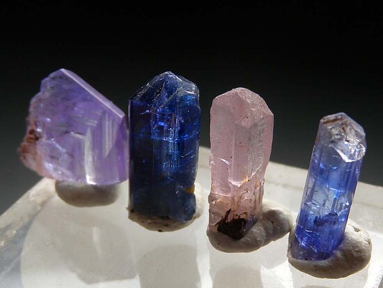 Tanzanite color suite of 4 crystals. From left to right: tabular, gemmy lavender colored crystal, deep blue prismatic crystal, pink Tanzanite, and lastly a color-zoned medium blue and colorless Tanzanite. All are terminated and complete all around.
